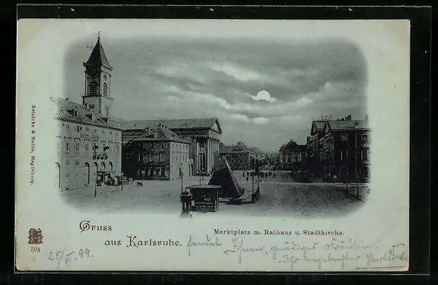 Mondschein-AK Karlsruhe, Marktplatz mit Rathaus und Stadtkirche