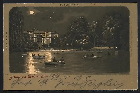 Mondschein-AK Karlsruhe, Stadtgartensee mit Booten