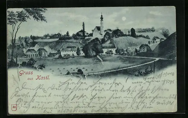 Mondschein-AK Kastl, Ortsansicht mit Kirche