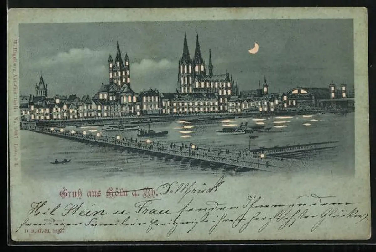 Mondschein-AK Köln a. Rh., Stadtansicht mit leuchtenden Fenstern, Halt gegen das Licht