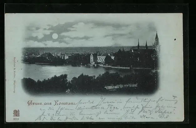 Mondschein-AK Konstanz, Ortsansicht hinter Wasser