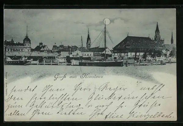 Mondschein-AK Konstanz, Uferpartie mit Kirche