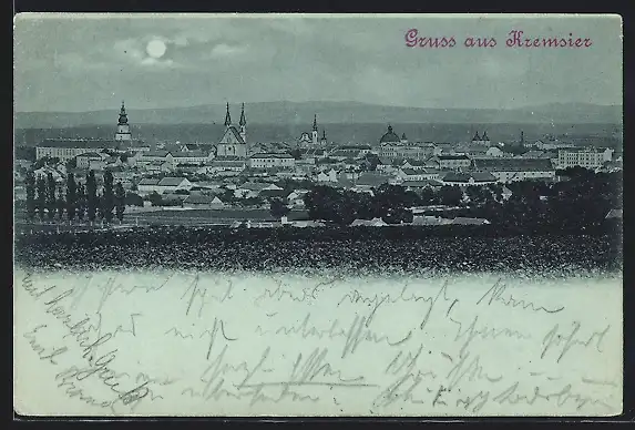 Mondschein-AK Kremsier, Panorama mit Kirche