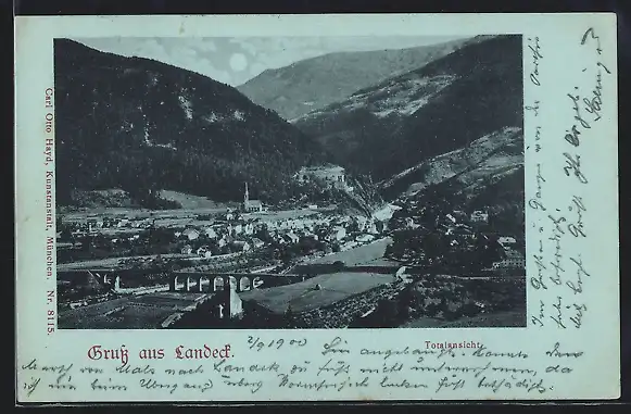 Mondschein-AK Landeck, Totalansicht mit Viadukt im Tal