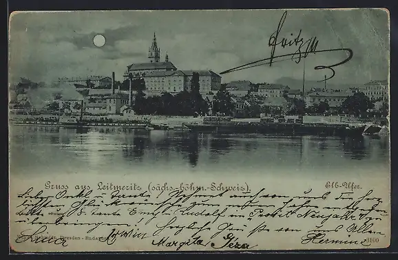 Mondschein-AK Leitmeritz /Sächs.-böhm.-Schweiz, Elb-Ufer