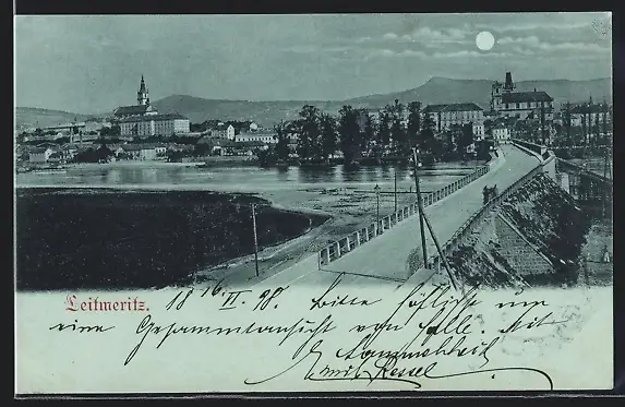 Mondschein-AK Leitmeritz, Uferpartie mit Brücke
