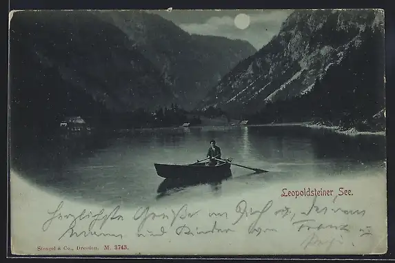 Mondschein-AK Leopoldsteiner See, Ruderboot auf dem See