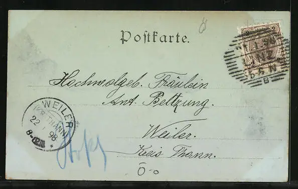 alte Ansichtskarte, gelaufen 1898, Bugspur mittig, guter Zustand
