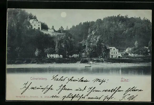 Mondschein-AK Linz, Calvarienberg mit Uferpartie