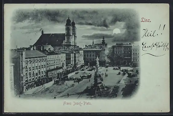 Mondschein-AK Linz, Franz Josef-Platz mit Kirche