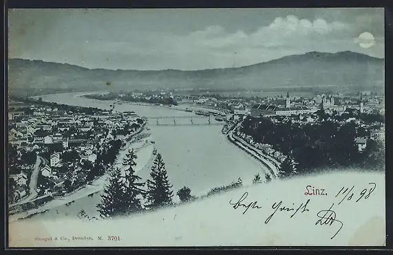 Mondschein-AK Linz, Ortsansicht bei Nacht