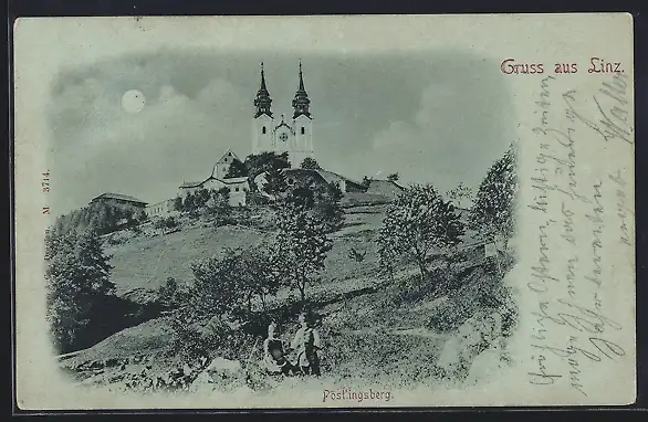 Mondschein-AK Linz, Pöstlingsberg mit Kirche