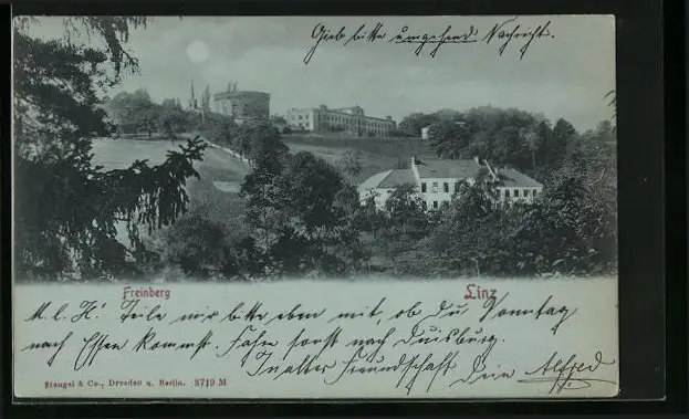 Mondschein-AK Linz a. D., Der Freinberg mit seinen Gebäuden