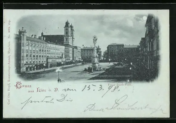 Mondschein-AK Linz a. D., Franz Josef-Platz mit Denkmal