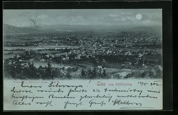 Mondschein-AK Linz a. D., Panoramablick vom Pöstlingberg