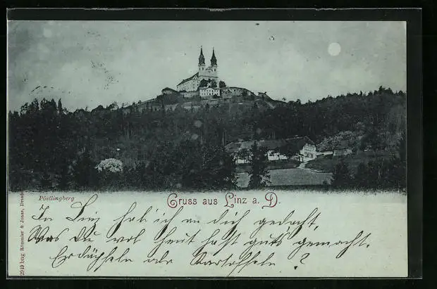Mondschein-AK Linz a. D., Pöstlingberg mit Kirche