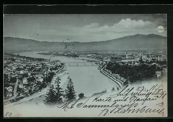 Mondschein-AK Linz a. D., Totalansicht aus der Vogelschau