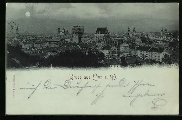 Mondschein-AK Linz a. D., Totalansicht bei Nacht