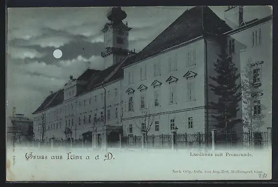 Mondschein-AK Linz a. d. D., Landhaus mit Promenade