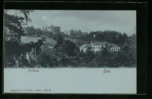Mondschein-AK Linz a. d. D., Ortspartie mit Blick nach Freinberg