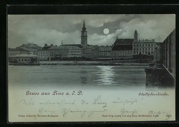 Mondschein-AK Linz a. d. D., Stadtpfarrkirche