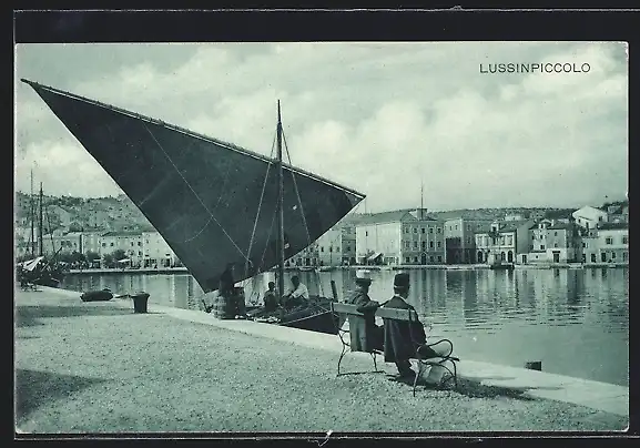 Mondschein-AK Lussinpiccolo, Uferpartie mit Ortspanorama und Segelboot