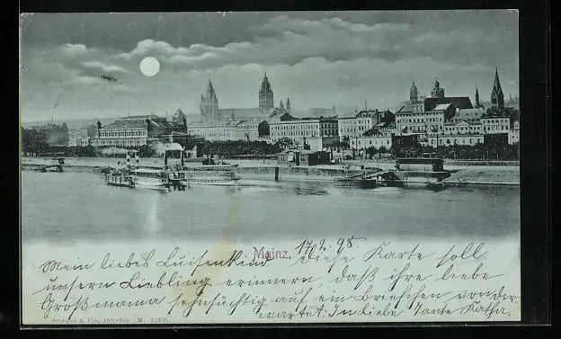 Mondschein-AK Mainz, Ortsansicht mit Dampfern