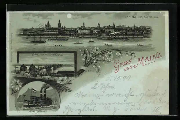 Mondschein-AK Mainz, Ortsansicht vom Castel aus, Neue Strassenbrücke, Rheindampfer