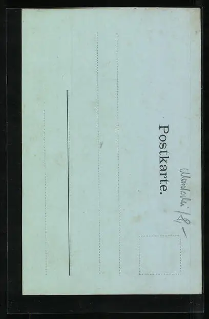 Personenbezogene Daten auf der Rückseite der Karte wurden durch blauen Textmarker unkenntlich gemacht. Die blauen Stellen sind auf die Vorderseite durchgeweicht und wirken sich negativ auf das Postkartenfoto aus