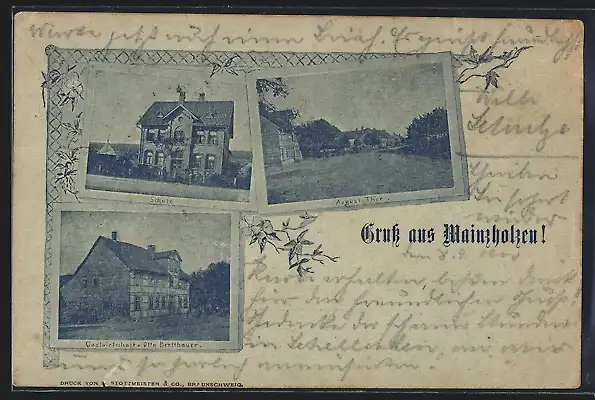 Mondschein-AK Mainzholzen, Gasthaus Otto Bretthauer, Schule, August-Thor
