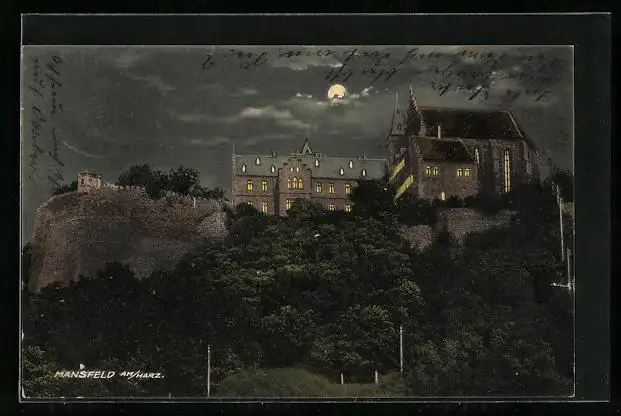 Mondschein-AK Mansfeld am Harz, Blick zum Burgberg