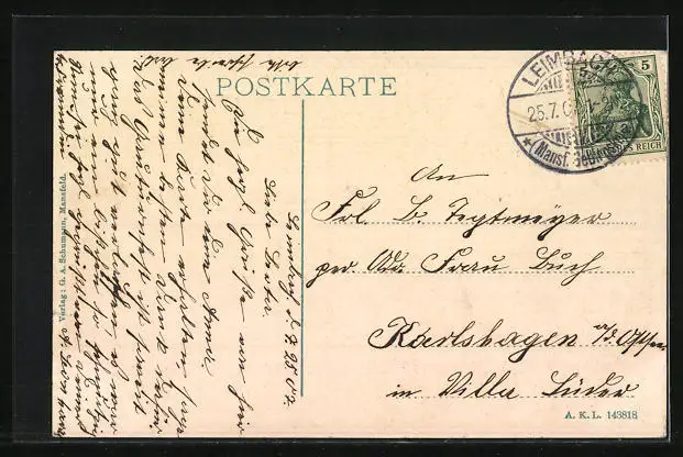Personenbezogene Daten auf der Rückseite der Karte wurden durch blauen Textmarker unkenntlich gemacht. Die blauen Stellen sind auf die Vorderseite durchgeweicht und wirken sich negativ auf das Postkartenfoto aus
