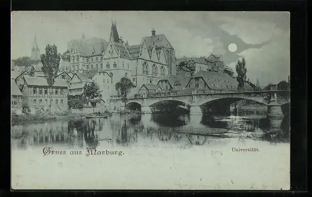 Mondschein-AK Marburg, Stadtpanorama mit Universität