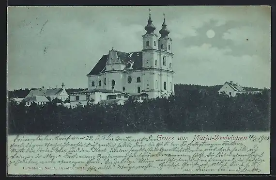 Mondschein-AK Maria-Dreieichen, Ortsansicht mit Kirche