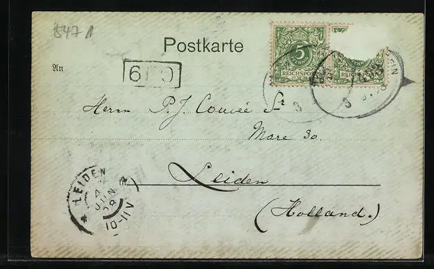 gelaufen 1898, Ecken bestoßen, Briefmarke entfernt, guter Zustand