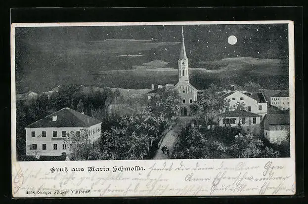 Mondschein-AK Maria Schmolln, Ortsansicht aus der Vogelschau