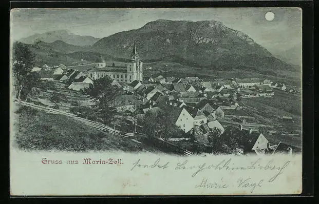 Mondschein-AK Maria-Zell, Teilansicht mit Kirche