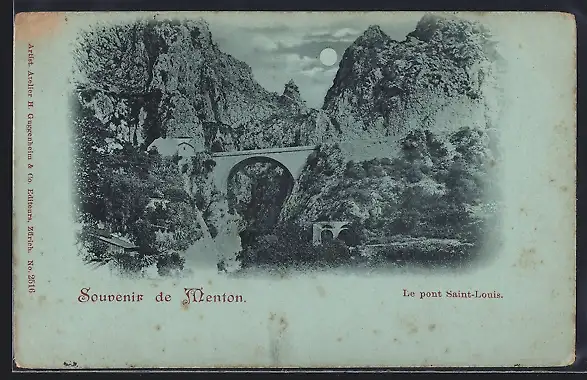 Mondschein-AK Menton, Le pont Saint-Louis sous la lune