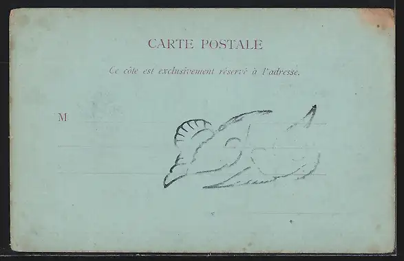 Personenbezogene Daten auf der Rückseite der Karte wurden durch blauen Textmarker unkenntlich gemacht. Die blauen Stellen sind auf die Vorderseite durchgeweicht und wirken sich negativ auf das Postkartenfoto aus