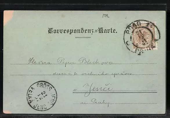 Personenbezogene Daten auf der Rückseite der Karte wurden durch blauen Textmarker unkenntlich gemacht. Die blauen Stellen sind auf die Vorderseite durchgeweicht und wirken sich negativ auf das Postkartenfoto aus