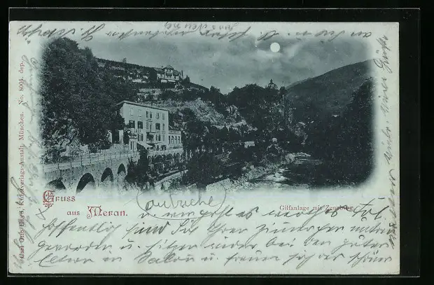 Mondschein-AK Meran, Gilfanlage mit Zenoberg