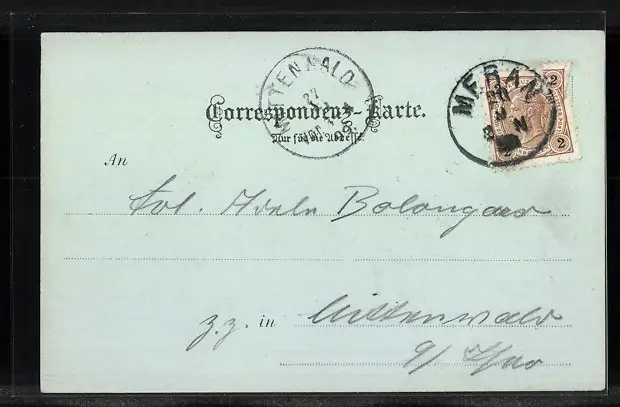 Personenbezogene Daten auf der Rückseite der Karte wurden durch blauen Textmarker unkenntlich gemacht. Die blauen Stellen sind auf die Vorderseite durchgeweicht und wirken sich negativ auf das Postkartenfoto aus