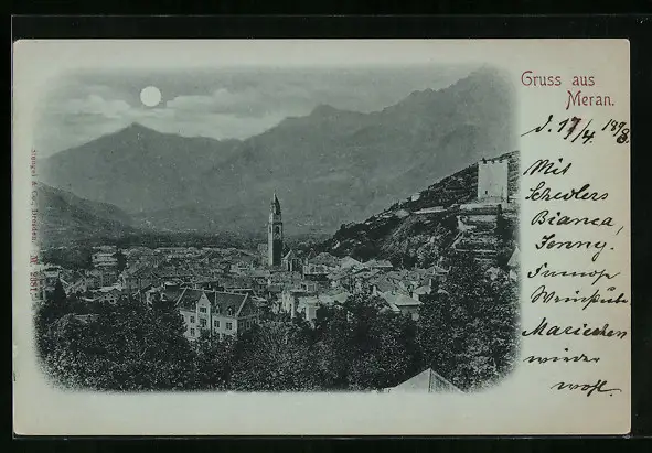 Mondschein-AK Meran, Ortsansicht aus der Vogelschau