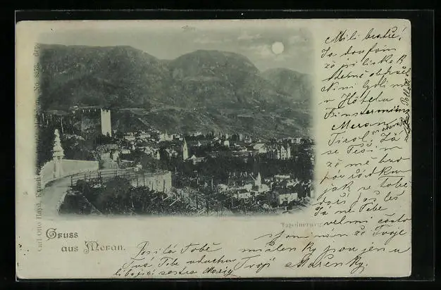 Mondschein-AK Meran, Ortsansicht mit Bergen