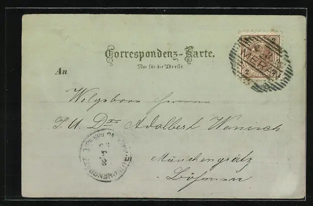 Personenbezogene Daten auf der Rückseite der Karte wurden durch blauen Textmarker unkenntlich gemacht. Die blauen Stellen sind auf die Vorderseite durchgeweicht und wirken sich negativ auf das Postkartenfoto aus