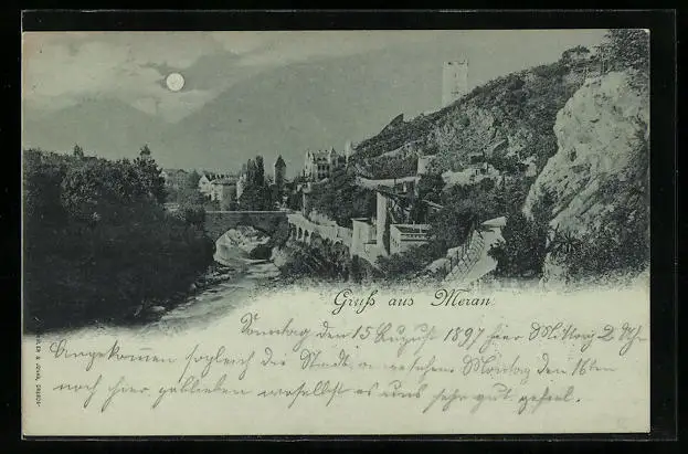 Mondschein-AK Meran, Teilansicht mit Brücke und Fluss