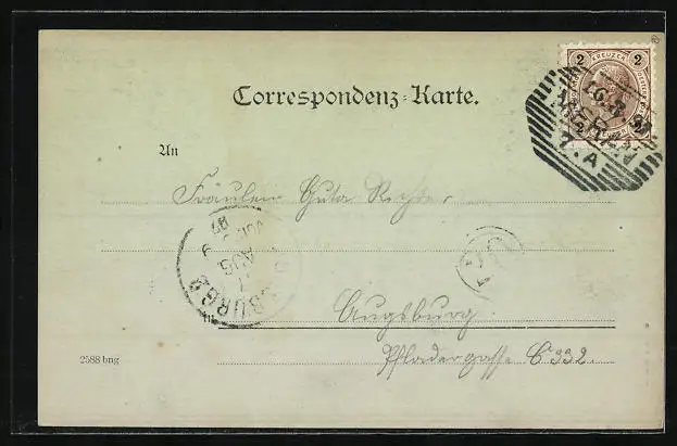 Personenbezogene Daten auf der Rückseite der Karte wurden durch blauen Textmarker unkenntlich gemacht. Die blauen Stellen sind auf die Vorderseite durchgeweicht und wirken sich negativ auf das Postkartenfoto aus