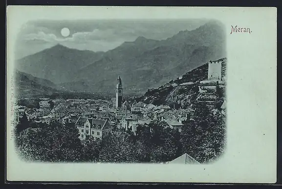 Mondschein-AK Meran, Totalansicht gegen die Berge