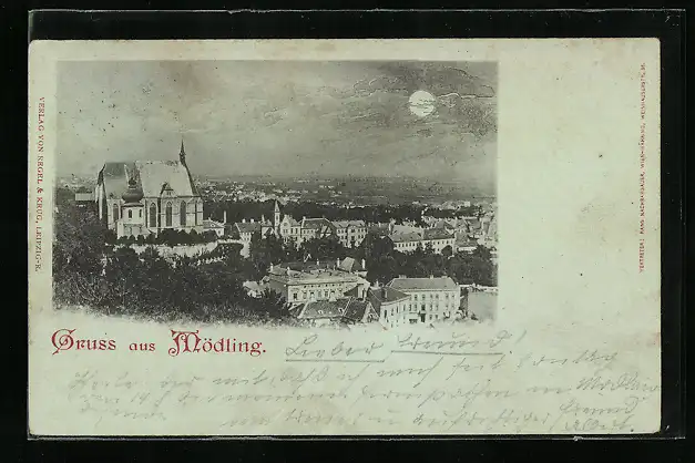 Mondschein-AK Mödling, Teilansicht mit Kirche