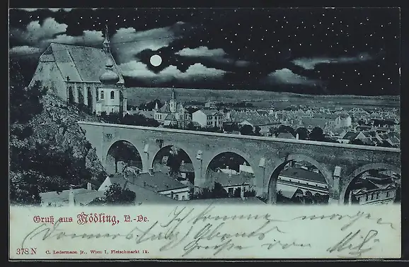 Mondschein-AK Mödling, Teilansicht mit Kirche und Viadukt